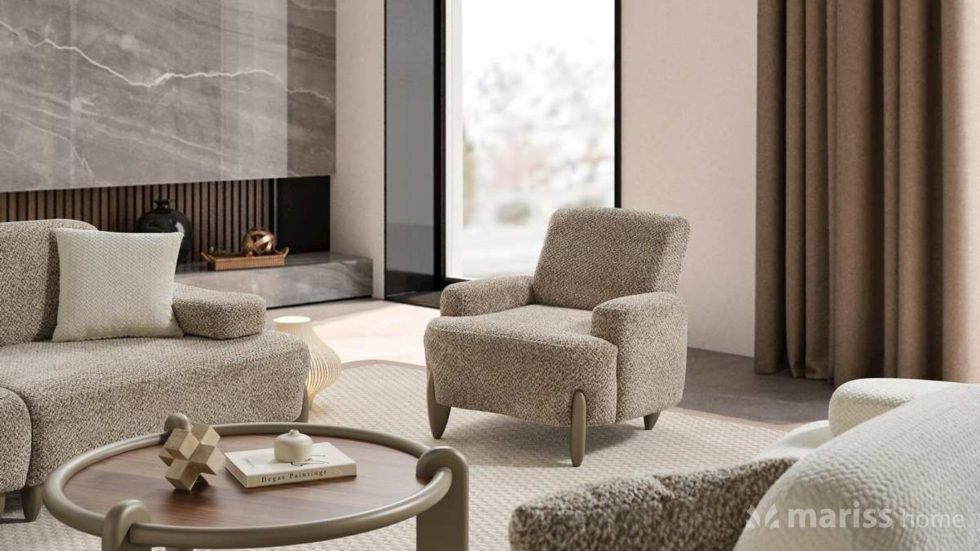 Yumuşak dokulu özel kumaşı, kıvrımlı hatlara sahip modern formu ve minimal ayak tasarımıyla salonunuza sıcak ama şık bir atmosfer kazandırır.